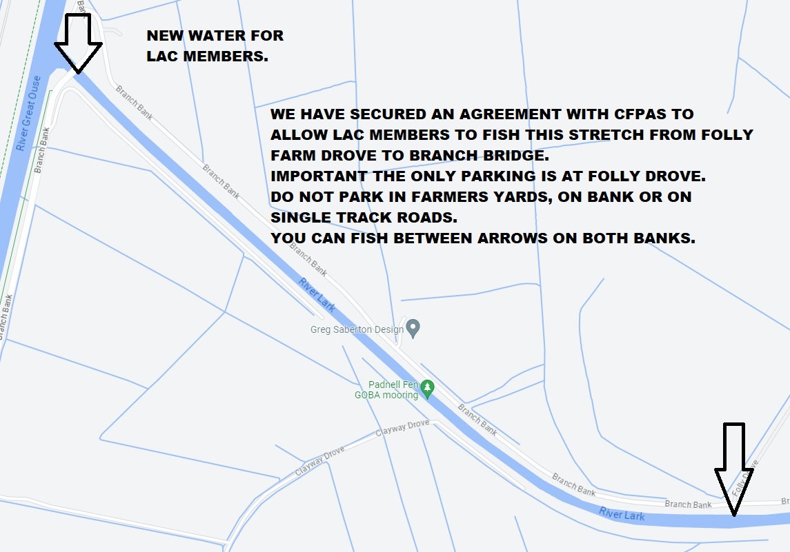 We have reached an agreement with CFPAS which allows our members to fish the River Lark downstream below Prickwillow. This section runs from Folly farm to Branch bridge on both banks. Please note that access and parking is very limited so please DO NOT block roads and field entrances when fishing here.
